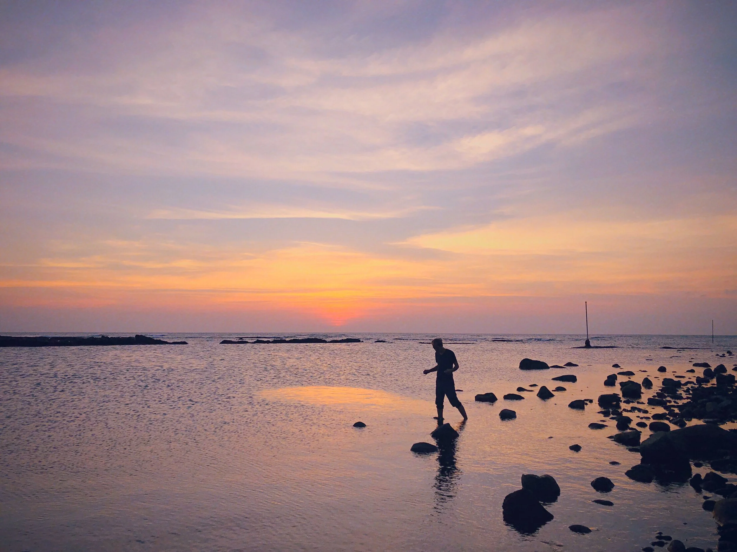 穿過林間,海岸旁有著一個鮮少人知的微型漁港,停了幾艘動力舢舨(CTS),應該作為夜晚於近海捕撈透抽、小管、煙仔魚等的作業船隻;走到漁港外,遠方的夕陽呈現出白色的球體,周邊的橙黃色光輝將海霞印照成璀璨且橘藍交織的色彩,與一旁在遠方變成黑色剪影的磯釣客們組合出海邊的穩定意象。