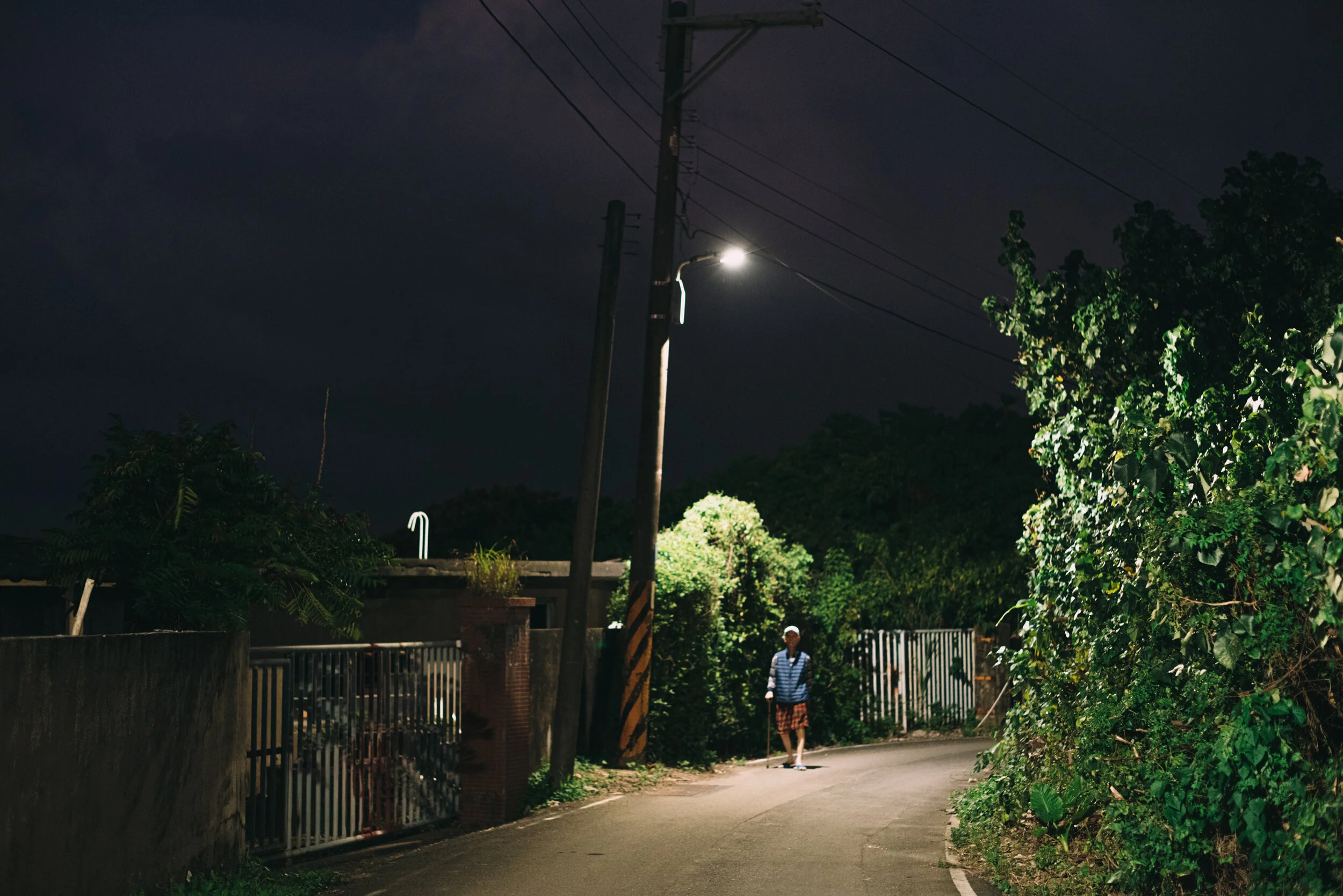 黑色的綄紗籠罩了這裡,街上的路燈也隨之亮起,下午經過的小路,也陸續有了村子的居民緩緩回到家中。這種純粹的生活感,白天從事農事的作業,時而相互幫忙與串門子,連結彼此的情感與資訊交流,夜晚各自回到自己的居所,日復一日,簡單的如此平靜。