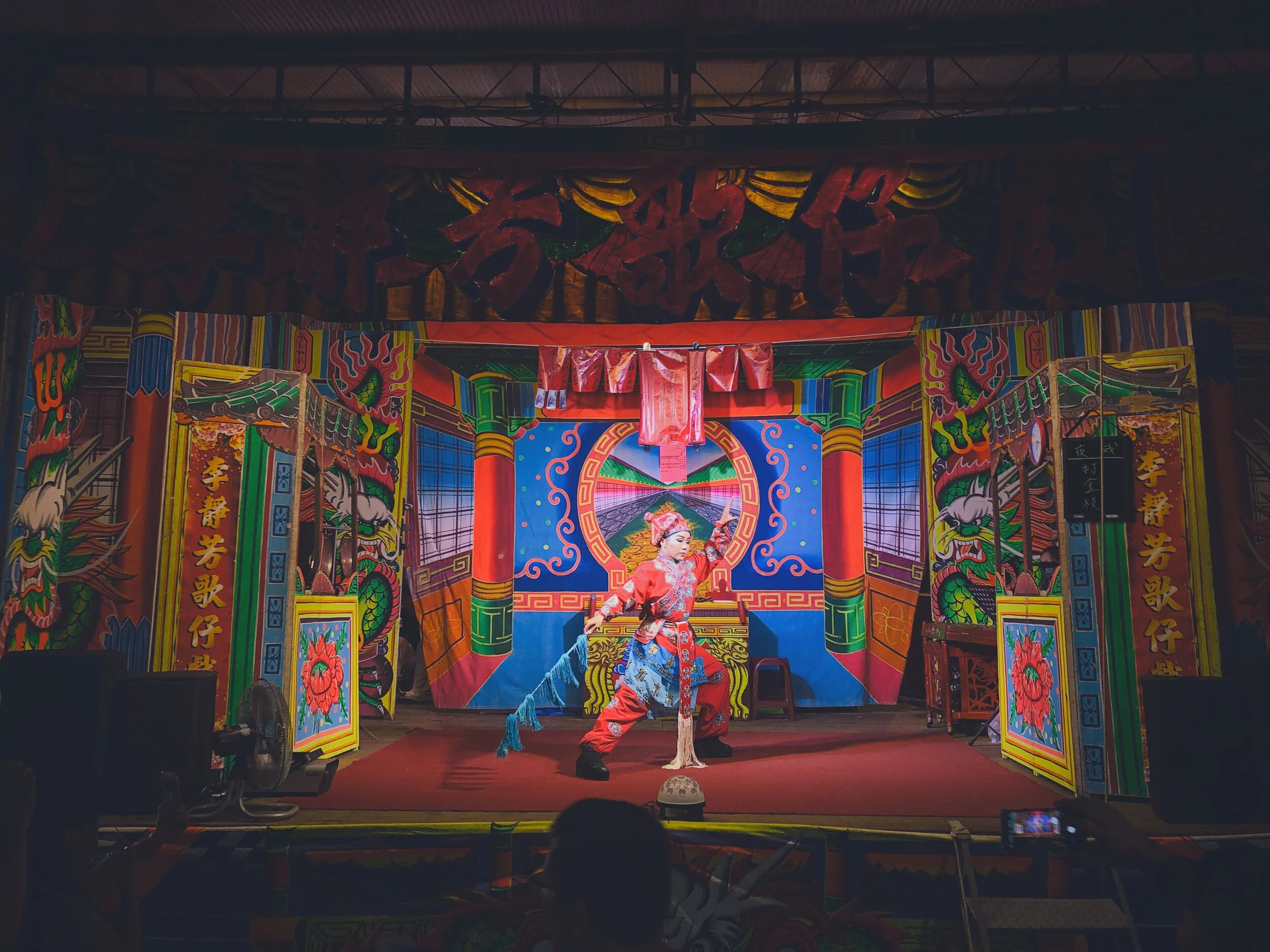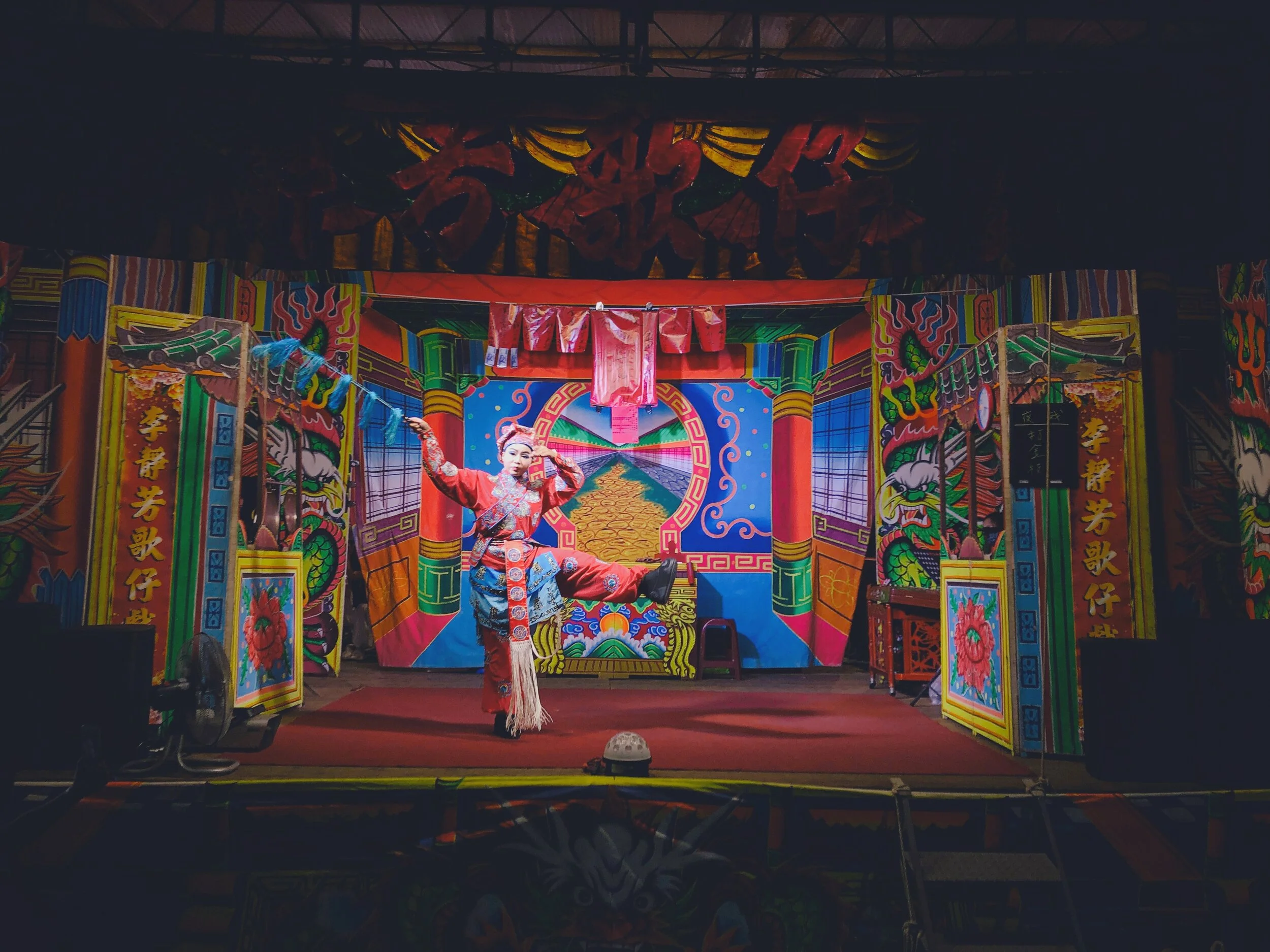 離開海濱小村,來到臨近的鎮子,正巧遇見夜裡的酬神野台戲場,使得原本只是來找尋一些在地小吃的過程變得更生活感;點了幾盤小吃在廟口旁的廣場坐下,看著台上歌仔戲班的演出。「若是沒有歌仔戲台的演出,也許這些小吃與空間就會乏味不少…」,邊看著戲邊這樣想著,便看見不管是本地居民,或是熙熙攘攘的遊客,也不禁停下腳步,找個可以坐或站著的空地,就這樣一起看著。